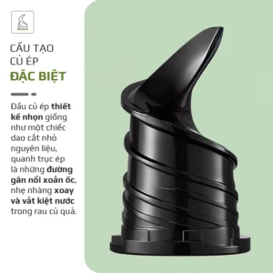 - Củ ép được đúc nguyên khối từ vật liệu cao cấp siêu bền, chống mài mòn. Kết hợp với thiết kế xoắn ốc và đường gân nổi bao quanh trục giúp tiếp xúc với nguyên liệu tốt hơn và vắt kiệt nước trong rau củ quả.