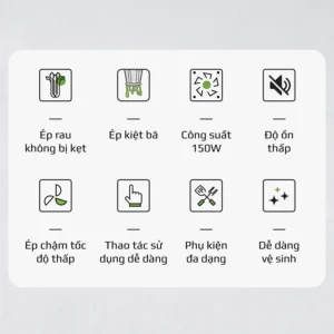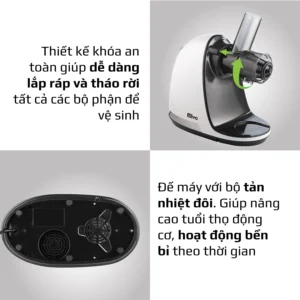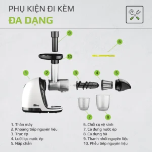 - Cốc lọc với 3 tầng lưới nhỏ dần, hỗ trợ ép kiệt hoàn toàn thực phẩm và cho ra thành phẩm có độ tinh khiết cao nhất.