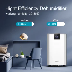 Máy hút ẩm Steiger STG – BW 55L là dòng máy hút ẩm hiện đại, với thiết kế tối giản và khả năng hút ẩm mạnh mẽ. Theo đó máy sở hữu công suất hoạt động lên đến 665W. Nhờ công dụng tuyệt vời này mà máy có thể mang lại không khí trong lành. Giúp bạn tạm biệt nỗi lo sợ với mùi ẩm mốc trong nhà, làm cho quần áo và chăn gối ẩm mốc, tạo mùi khó chịu.