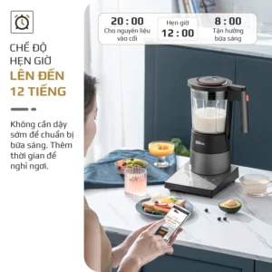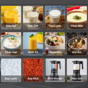- 13 chức năng bao gồm: Sữa Hạt, Sữa 35P, Sữa Lạnh, Cháo Mịn, Cháo Hạt, Sinh Tố, Hấp&Hầm, Giữ Ấm, Xay Lạnh, Xay Khô, Khử Khuẩn, Hẹn Giờ, Xay Tùy Chỉnh. Mỗi tính năng đều được setup thời gian và nhiệt độ phù hợp với nguyên liệu tương ứng giúp thành phẩm món thơm ngon và giữ trọn vẹn được dinh dưỡng.