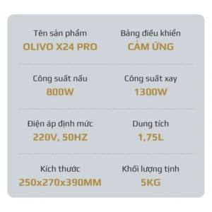 - Với những cải tiến vượt trội, OLIVO X24 PRO là một lựa chọn lý tưởng cho những người yêu thích chế biến các món ăn từ hạt, đậu. Máy giúp bạn dễ dàng có được những món ăn thơm ngon, bổ dưỡng và cực kỳ tốt cho sức khỏe của cả gia đình.