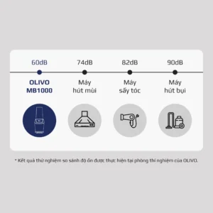 - Tại phòng thực nghiệm của OLIVO, chúng tôi đo được độ ồn của OLIVO MB1000 chỉ ở mức 60dB. Đây là mức độ ồn chấp nhận được và không làm ảnh hưởng tới mọi người xung quanh. Đảm bảo mang lại cho khách hàng trải nghiệm tuyệt vời nhất khi sử dụng sản phẩm.