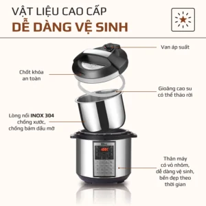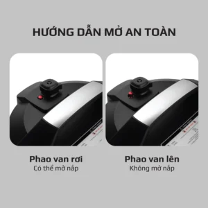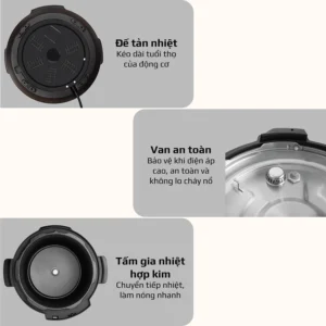 - Nồi được trang bị van áp suất an toàn tuyệt đối, giúp giữ áp suất khi nấu, và xả áp suất sau khi nấu xong. Van áp suất kết hợp cùng với các cảm biến điện tử giúp nồi điều chỉnh mức áp suất vừa đủ trong nồi trong quá trình nấu không còn lo vấn đề quá áp suất gây nguy cơ phát nổ như những nồi truyền thống.