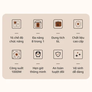 - Với 16 tính năng được cài đặt sẵn, công việc của bạn chỉ là tẩm ướp gia vị cho thực phẩm vào nồi và chỉ một nút bấm và chờ đợi thành phẩm chính là món ăn ngon xuất sắc có ngay trên bàn ăn.