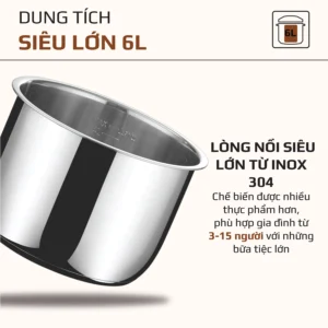 - Dung tích lớn 6L giúp người sử dụng có thể chiến biến lượng thực phẩm nhiều hơn, đảm bảo phù hợp với những gia đình đông người có số lượng từ 6-8 người.