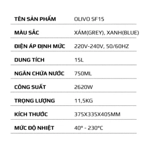 - Nồi Chiên Hơi Nước OLIVO SF15 là sản phẩm nồi chiên hơi nước thế hệ mới nhất của OLIVO – Thương hiệu gia dụng cao cấp đến từ Mỹ. Đây là dòng sản phẩm mang tính đột phá, bùng nổ công nghệ với sự kết hợp giữa nồi chiên không dầu và nồi hấp mang đến sự tiện lợi cho khách hàng. Đặc biệt có những tính năng chỉ có trên OLIVO SF15 mà chưa từng có trên bất kỳ sản phẩm cùng loại nào trên thị trường.