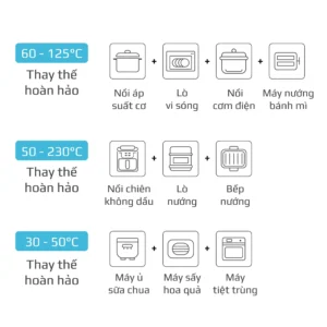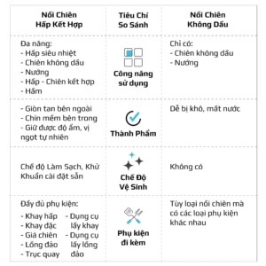 Chiên không dầu chiên đồ ăn vàng giòn mà không cần dùng đến dầu mỡ, giảm đến 95% lượng dầu mỡ dư thừa trong bữa ăn hàng ngày. Trong khi đó, hấp đồ ăn bằng hơi nước siêu nhiệt giúp giảm thời gian hấp, đồng thời bảo toàn tối đa dinh dưỡng có trong thực phẩm.