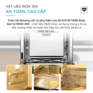An toàn: Đặt sức khoẻ của khách hàng làm tiêu chí hàng đầu, toàn bộ khoang nồi và phụ kiện của Phiên bản đặc biệt nồi chiên hấp OLIVO SF1600 được làm từ INOX 304 cao cấp – chất liệu được sử dụng trong y tế và đạt chứng nhận an toàn khi tiếp xúc với thực phẩm ở nhiệt độ cao.