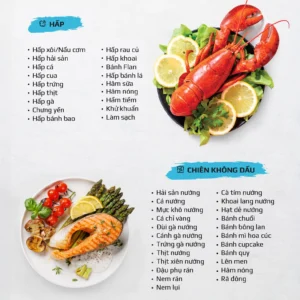 Đa dạng chế biến: Bạn có thể sử dụng nồi chiên hấp đa năng tích hợp công nghệ Nano Steam để chế biến nhiều món ăn khác nhau, từ hấp rau củ, hải sản đến các món hầm, tiềm.