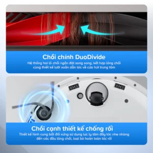 - Hệ thống chống rối 3 lớp thông minh: Bộ ba chổi chính DuoDivide, chổi cạnh chống rối, và bánh xe đa hướng vận hành đồng bộ
