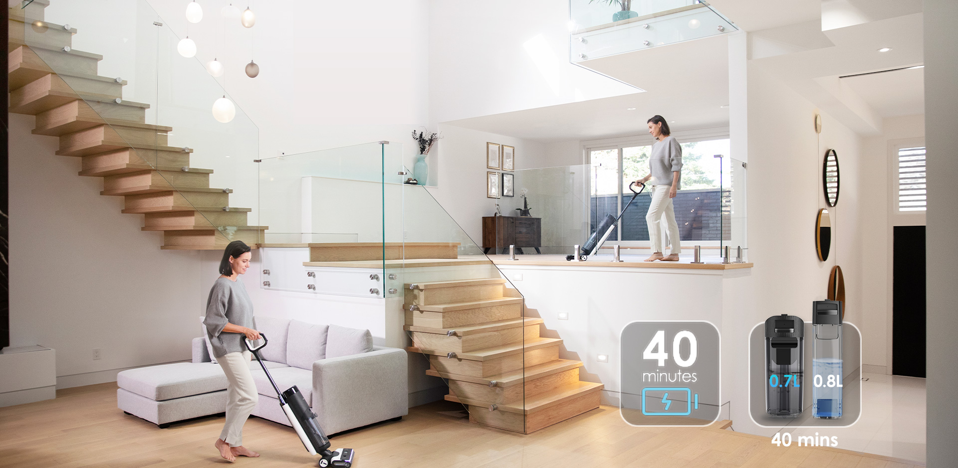 Khay chứa nước và dung lượng pin đủ để dọn dẹp liên tục lên tới 40 phút